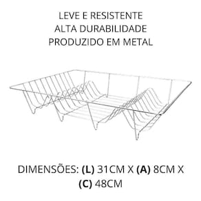 Escorredor De Louça Aramado 18 Pratos - Ferro Uma solução robusta e prática para quem deseja manter a bancada da cozinha organizada. Fabricado em metal resistente com pintura ou acabamento preto, o design permite um eficiente escoamento da água, evitando acúmulo e permitindo que pratos, copos e talheres sequem mais rapidamente . Seu formato tipo cama oferece suporte para cerca de 18 pratos dispostos verticalmente, conferindo organização e praticidade durante o uso, que facilita a limpeza e evita respingos sobre a pia ou bancada. A estrutura leve e compacta é ideal para quem busca otimização do espaço sem abrir mão de resistência e durabilidade Especificações: Dimensões: 48?cm de comprimento, 31?cm de largura e 9?cm de altura Material: Ferro Cor: Cromado Peso Aprox.: 300g