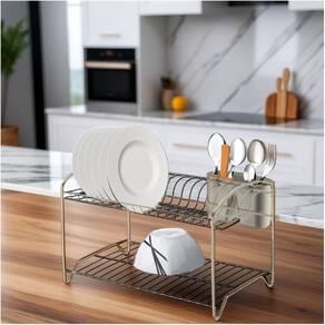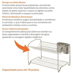 O Escorredor de Louças conta com uma estrutura em aço piatina (aço em formato achatado) que proporciona design diferenciado e traz beleza para cozinha. Possui 2 andares o que garante mais espaço para armazenar as louças, além de possuir porta talheres removível.