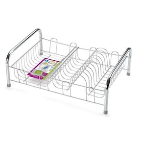 Escorredor de louça em aço cromado, com capacidade para 11 pratos , 8 copos e espaço para talheres, com altura 19,1 cm, comprimento 54,3 cm, largura 17,1 cm, peso aproximado 1,215 kg e cor predominante prata.