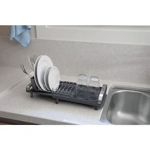 Para aqueles dias de rotina corrida que você não tem muito tempo para as tarefas de casa, conte com o escorredor de louça Tramontina em aço Inox com secador e porta talheres compacto grafite. Desenvolvido especialmente para cozinhas pequenas e que possuam bancadas com pouco espaço, ele conta com produção em aço inox e com um prático porta talheres em polipropileno com perfeito encaixe em sua superfície. Compacto mais sem deixar de acomodar as louças que você precisa, ele comporta 9 pratos, talheres e copos, sendo o porta copos expansível. Possui alças que proporcionam maior no manuseio e inclinação que direciona a água para a bandeja coletora, fazendo com que ela caia direto para a pia. Um item prático e indispensável para quem está sempre na correria!