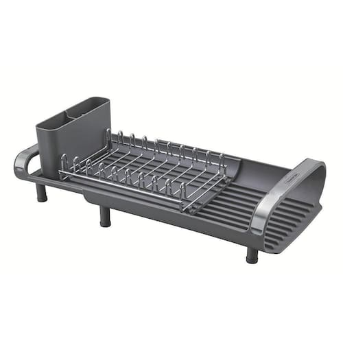Para aqueles dias de rotina corrida que você não tem muito tempo para as tarefas de casa, conte com o escorredor de louça Tramontina com secador e porta talheres compacto grafite. Desenvolvido especialmente para cozinhas pequenas e que possuam bancadas com pouco espaço, ele conta com um prático porta talheres em polipropileno com perfeito encaixe em sua superfície. Compacto mais sem deixar de acomodar as louças que você precisa, ele comporta 9 pratos, talheres e copos, sendo o porta copos expansível. Possui alças que proporcionam maior segurança no manuseio e inclinação que direciona a água para a bandeja coletora, fazendo com que ela caia direto para a pia. Um item prático e indispensável para quem está sempre na correria!