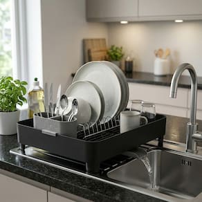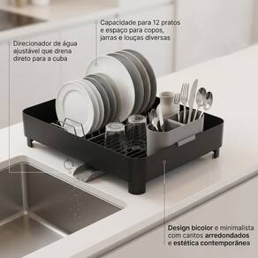 Composto por duas partes, ele acomoda desde detergente e escova até sabão e esponja, criando um fluxo mais prático e organizado.