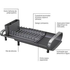 Características: Marca: Tramontina Código do Fabricante: 61537000 Linha: Plurale Cor: Preto Material: Aço inox Material dos Suportes: Polipropileno Capacidade: 9 Pratos, Copos e Talheres Contém Porta-Talheres: Sim Contém Porta-Copos: Sim (expansível)