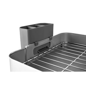 Pés de silicone, não escorrega nem arranha as superfícies. Porta-talheres de polipropileno, com encaixe no corpo do escorredor. Capacidade: é possível acomodar 10 pratos, copos e talheres. Alças para maior no manuseio. Design compacto. Dispõe de uma inclinação que direciona a água que escorre da louça na bandeja coletora, fazendo com que ela caia de modo direto na pia, deixando seu ambiente sempre seco e limpo. NA Ean: 7891116181195