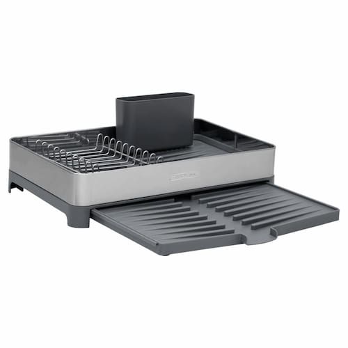 O escorredor possui um porta-copos expansível, proporcionando mais espaço e flexibilidade para organizar a louça.