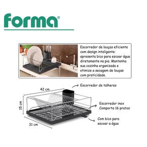 Com estrutura aramada resistente, o escorredor é durável e capaz de suportar uma variedade de utensílios de cozinha. Além disso, o Escorredor de Louças Forma Inox conta com um prático porta talheres em plástico, garantindo ainda mais organização ao seu ambiente e uma bandeja plástica coletora de pingos, deixando sua pia sempre seca!