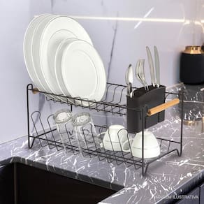 Toda a sua louça tem lugar garantido e a sua cozinha fica muito mais organizada. O Escorredor de Louças Duplo Eco Black Arthi possui uma parte superior, perfeita para pratos de diferentes tamanhos e uma base reta especialmente desenhada para acomodar com segurança copos, xícaras e demais itens. O produto inclui, ainda, um porta-talheres em plástico que pode ser facilmente encaixado no corpo do escorredor.