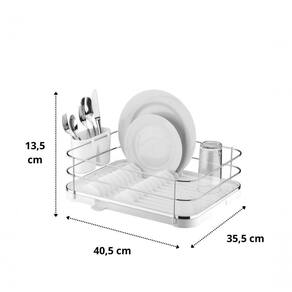 O Escorredor de Louças possui bico fixo para vazão da água. Você direciona essa saída de água para dentro da cuba e a pia fica sempre seca. Tem capacidade para 11 pratos e um porta talheres removível, que pode ser posicionado onde for mais conveniente. É fabricado em ABS e aço carbono, com detalhe em aço piatina cromado (aço em formato achatado).