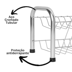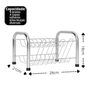 Com estrutura em aço cromado de alta resistência, o escorredor comporta até 9 pratos na parte superior e 4 copos na lateral, proporcionando uma organização eficiente no dia a dia. Seu design vertical otimiza o espaço e mantém os utensílios seguros durante a secagem.