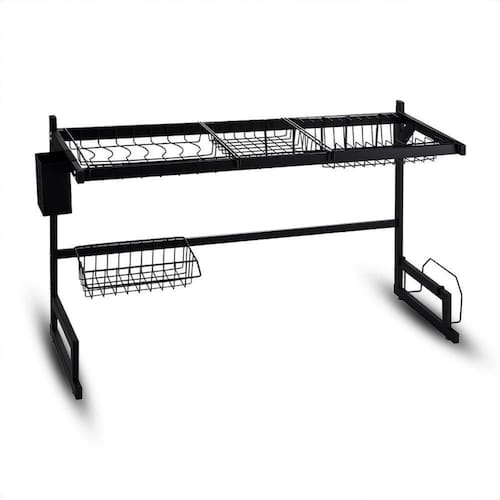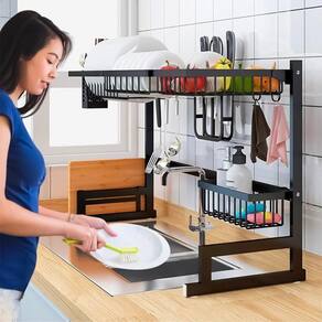 Economiza espaço: instala sobre a pia, liberando bancada. Multi compartimentos: pratos, copos, talheres, panelas, tábuas, detergente e utensílios ao alcance. Facilita a limpeza: água escorre direto para a pia. Durabilidade: aço carbono com pintura eletrostática preta, resistente à umidade e à corrosão. Ideal para cozinhas pequenas e apartamentos, mantendo tudo à mão.