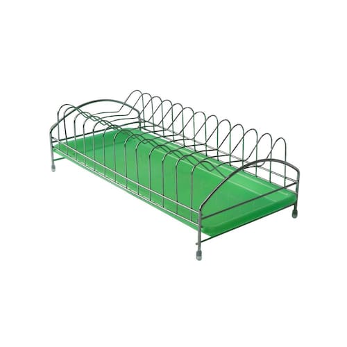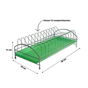 O escorredor de pratos é feito de metal e plástico resistente e durável, projetado para acomodar e secar com eficiência uma variedade de pratos. Possui um design prático e funcional, com 12 compartimentos individuais para organizar os pratos durante a secagem.