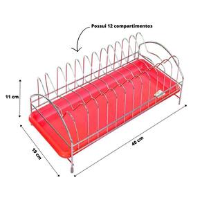 Informações técnicas: Dimensões escorredor: C: 40cm x A: 11cm x L: 19cm Dimensões: bandeja: C: 42cm x A: 2cm x L: 14cm Composição: Metal e Plástico Peso: 331 gramas