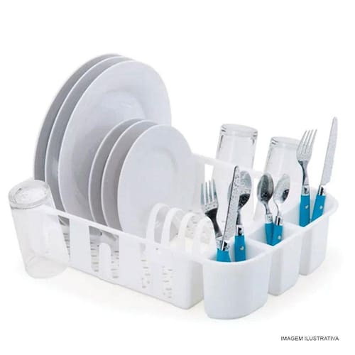 Deixe sua pia ainda mais organizada com o Escorredor de pratos talheres e copos 42,5cm plástico Branco, ele possui um excelente tamanho e será bem versátil, com bastante espaço para deixar a louça secar. Com capacidade para 11 pratos, 6 copos, talheres e para o que mais você quiser ele será ideal para uma maior praticidade no seu dia a dia, tem uma cor neutra que combinará com todos os outros utensílios de sua cozinha. Além de ser fabricado em material de qualidade, resistência e durabilidade.Informações importantes;Medidas aproximadas - 42,5 x 30,5 x 9,5cm(Comprimento x Largura x Altura)Composição - PolipropilenoCor - BrancoValidade - IndeterminadaFabricante - NitronProduto 100% NacionalMais Informações;Antes da primeira utilização, lave-o com água quente e detergente.Nunca utilize palha de aço, pois causa riscos e prejudica a beleza do produto.Enxágue bem para retirar o detergente, pois sua composição abrasiva também pode danificar.Após a limpeza, enxugue imediatamente para evitar formação de manchas.Evite guardá-lo em locais úmidos, o atrito com outras peças e contato com superfícies quentes. Escorredor de pratos talheres e copos 42,5cm plástico Branco