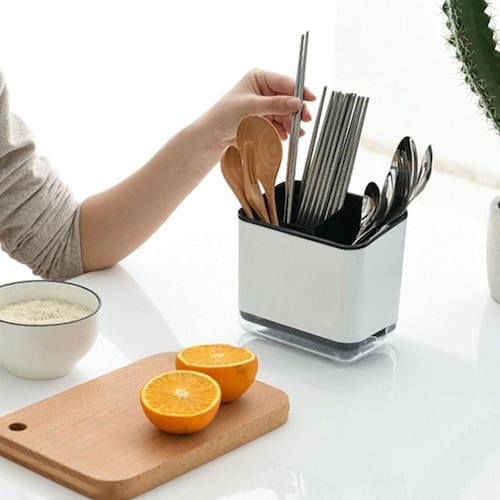 Com três divisórias e um compartimento para armazenar a água nosso porta talheres conta também com uma base para vasão da água que é removível, o que facilita a limpeza e a higienização. Para isso você vai precisar de apenas uma esponja macia e detergente neutro.