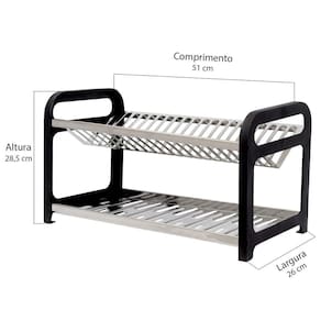 Com medidas de altura de 28,5cm, largura de 26cm e comprimento de 51cm, este escorredor é compacto e se encaixa perfeitamente em qualquer espaço. Seu peso aproximado é de 1,450kg, o que facilita seu manuseio e transporte.