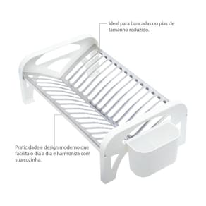 Com capacidade para acomodar até 12 pratos, o escorredor também possui um suporte para talheres que pode ser utilizado nas duas extremidades, proporcionando ainda mais praticidade e organização. Além disso, suas dimensões compactas - altura de 15cm, largura de 26cm e comprimento de 41,5cm - o tornam perfeito para bancadas ou pias de tamanho reduzido.