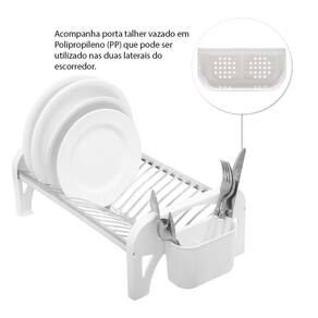 Com capacidade para acomodar até 12 pratos, o escorredor também possui um suporte para talheres que pode ser utilizado nas duas extremidades, proporcionando ainda mais praticidade e organização. Além disso, suas dimensões compactas - altura de 15cm, largura de 26cm e comprimento de 41,5cm - o tornam perfeito para bancadas ou pias de tamanho reduzido.