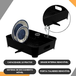========== sobre o produto ========== O escorredor de louça com capacidade para 10 pratos e porta talheres é o complemento ideal para a sua cozinha, oferecendo praticidade e organização na hora de secar suas louças. Com um sistema de escorrimento móvel e uma grade interna, este escorredor proporciona uma secagem eficiente e rápida, mantendo seus pratos, copos e talheres organizados e livres de manchas. Além disso, o porta talheres removível permite uma fácil limpeza e acomodação dos utensílios. Seu design moderno e funcional se adapta a qualquer estilo de cozinha, garantindo praticidade e beleza ao ambiente. ========== especificações ========== Comporta até 10 pratos, proporcionando espaço suficiente para secar louças de uma refeição completa. Sistema de escorrimento móvel que facilita o escoamento da água e evita o acúmulo de umidade. Grade interna que auxilia na organização dos utensílios e evita que escorram para fora do escorredor. ========== ficha técnica ========== Medidas: 43 x 34,5 x 11cm Material: plástico + aço carbono Capacidade: 10 pratos Marca: future : 3 meses Estamos online para quaisquer dúvidas, Agradecemos e aguardamos o seu pedido. Marca: Não Informado