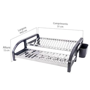 Escorredor de pratos com duas superfícies para acomodação de pratos, louças talheres, panelas e tudo mais que você usa em sua cozinha. Suas bandejas de acomodação ficam unidas lateralmente em bases de polipropileno pp na cor preta que deixam seu escorredor firme e com um design moderno. Acompanha porta talher em polipropileno pp que pode ser instalado nas duas laterais do escorredor. A disposição das bandejas lateralmente permitem acomodar ou empilhar mais louças e utensílios que os escorredores tradicionais. Bonito, prático e de fácil limpeza. Altura: 15cm; Largura: 44,8cm; Comprimento: 51cm; Peso aprox. 1,450kg. Ean: 7898681710867