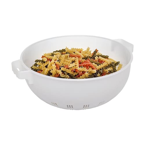 Este excelente escorredor multiuso é uma otima aquisição que ajudará na hora da preparação dos alimentos, prático, versátil e fácil de usar. Ideal para quantidades maiores de massa. Furos menores que não deixam a massa cair fora do recipiente