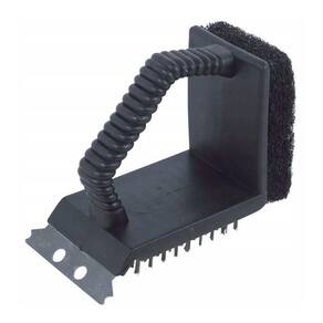Cerdas de aço para remoção de sujeiras difíceisEsponja abrasiva para limpeza detalhadaRaspador metálico para resíduos grudadosCabo ergonômico para melhor manuseioIdeal para grelhas, chapas, churrasqueiras e superfícies metálicas