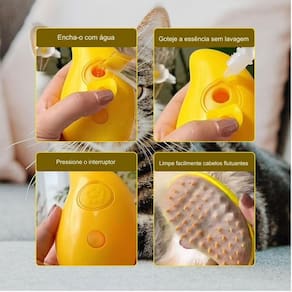 A escova é muito simples de usar. Basta encher o recipente de água e apertar o botão. O vapor vai começar a sair e só escovar o seu animal de estimaçao, massageando e removendo os pelos.