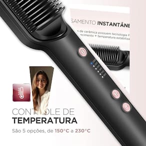 A escova oferece |5 opções de temperatura|, variando de 150°C a 230°C, para atender às necessidades de diferentes tipos de cabelo. Basta selecionar a temperatura desejada, aguardar o aquecimento e deslizar a escova pelas mechas. O resultado é um liso |instantâneo| e duradouro!