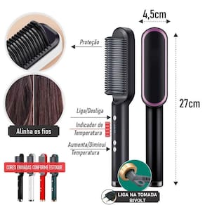 Escova Alisadora Secadora Modeladora Elétrica Pente Chapinha Escova Alisadora Modelara Elétrica A Escova alisadora de cabelos, foi especialmente desenvolvida para FACILITAR totalmente a sua vida, graças a sua tecnologia de alisar cada mecha do cabelo de maneira individual e ao mesmo tempo, sem causar danos aos fios, poupando seu tempo para que você possa aproveitar ainda mais o seu dia estando sempre arrumada, com os cabelos lisos e alinhados de forma rápida e prática. BENEFÍCIOS:- Economia de tempo: Com a Tecnologia de Multiplacas, possui uma grande área de contato que permite que mais cabelo passe pela escova, em menos passadas.- Contém cerdas de cerâmica em formato V que dão brilho, maciez, reduz a quebra dos fios e pontas duplas em até 50%- Alcança a raiz do cabelo sem queimar entregando a você cabelos lindos e saudáveis em poucos minutos.- Em quanto alisa, reduz os danos ao cabelo.- Contém a potencia de uma chapinha profissional- Protege o cabelo com suas cerdas de cerâmica iônica- Contém proteção contra queimaduras no couro cabeludo- Fácil de manusear- Produto leve e portátil- Não marca o cabelo- Oferece facilidade e rapidez para uso no dia a dia- Contém um design elegante, ergonômico e multifuncional- Oferece aquecimento rápido- Oferece efeito profissional- Oferece temperatura uniforme em toda a superfície de aquecimento- Contém controle de temperatura de 140C a 200C- Indicado para uso doméstico e profissional ESPECIFICAÇÕES TÉCNICAS:- Potência: 45W- Frequência nominal: 50Hz-60Hz- Voltagem: Bivolt 110-240v - Material das placas: Cerâmica PTC- Temperatura: 5 níveis