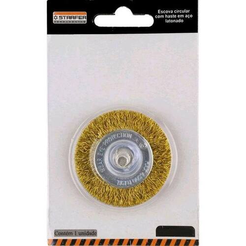 Escova Circular Com Haste para Furadeira 75Mmx10Mm Starfer Escova circular com haste, cerdas em aço latonado e corpo em aço carbono, 75mm diâmetro x 10mm haste , para uso em furadeiras.