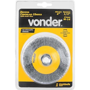 Conteúdo Embalagem:1 Escova circular cônicaDestaques e diferenciais: Possui formato cônico proporcionando praticidade na operaçãoAplicações e dicas de uso:Indicada para limpeza de peças em geral. Utilizada em esmerilhadeira angular.Características Técnicas:Material/acabamento das cerdas da escova: Aço carbono/polido Tipo de cerdas da escova: Ondulada Diâmetro externo da escova pol : 4.0/0 Espessura da escova pol : 0.1/2 Diâmetro da rosca da escova : M-14 Rotação máxima rpm : 12500 /minGarantia: legal: 90 dias Marca: Não Informado