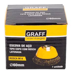 Escova De Aço Latonado Tipo Copo Com Rosca 571,0014 - Graff A Escova de Aço Latonado tipo Copo com Rosca é Utilizado para limpar suavemente superfícies de metal, ferrugem e sujeira. E serve tanto pra limpeza como pra remoção de ferrugens, vernizes e tintas. Sendo mais flexível que as outras e também serve pra polir, lixar e eliminar tintas e ferragens. Aplicação: Metais em geral. Espessura do fio de aço latonado: 0,30mm - Especificações técnicas: Dimensões do produto: 65x77x77 mm Peso: 0,162g Rosca: M14 Medidas mm : 60 RPM: 12.500 Referência: 571,0014 Marca: Graff Vantage A Escova de Aço Latonado tipo Copo com Rosca é Utilizado para limpar suavemente superfícies de metal, ferrugem e sujeira. E serve tanto pra limpeza como pra remoção de ferrugens, vernizes e tintas. Sendo mais flexível que as outras e também serve pra polir, lixar e eliminar tintas e ferragens.
