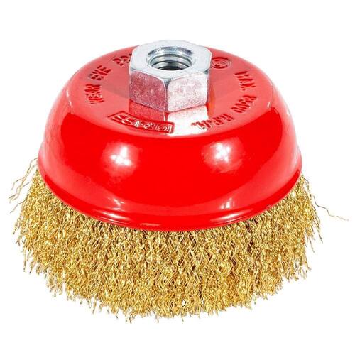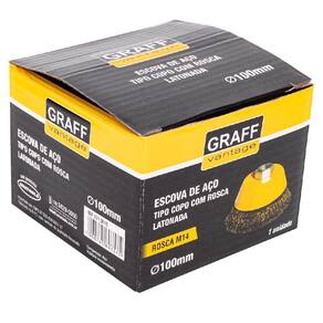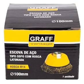 Escova De Aço Latonado Tipo Copo Com Rosca 571,0015 - Graff A Escova de Aço Latonado tipo Copo com Rosca é Utilizado para limpar suavemente superfícies de metal, ferrugem e sujeira. E serve tanto pra limpeza como pra remoção de ferrugens, vernizes e tintas. Sendo mais flexível que as outras e também serve pra polir, lixar e eliminar tintas e ferragens. Aplicação: Metais em geral. Espessura do fio de aço latonado: 0,30mm - Especificações técnicas: Dimensões do produto: 78x107x107 mm Peso: 0,36g Rosca: M14 Medidas mm : 100 RPM: 8.500 Referência: 571,0015 Marca: Graff Vantage A Escova de Aço Latonado tipo Copo com Rosca é Utilizado para limpar suavemente superfícies de metal, ferrugem e sujeira. E serve tanto pra limpeza como pra remoção de ferrugens, vernizes e tintas. Sendo mais flexível que as outras e também serve pra polir, lixar e eliminar tintas e ferragens. Marca: Não Informado
