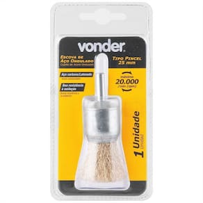 Escova de Aço Pincel Vonder 25mm - A escova de Aço Pincel Vonder 25mm é indicada para limpeza de peças em geral. Utilizada em furadeiras. Possui acabamento latonado que proporciona boa resistência à oxidação. Características Gerais do Produto: Marca: Vonder Modelo: Pincel Referência: 63.25.025.000 Diâmetro Externo: 25 mm Diâmetro da Haste: 6 mm Rotação: Máxima: 20000 /min Material: Aço carbono/latonado Acompanha o produto: 01 Escova de Aço Pincel Vonder 25mm : 3 Meses Marca: Não Informado