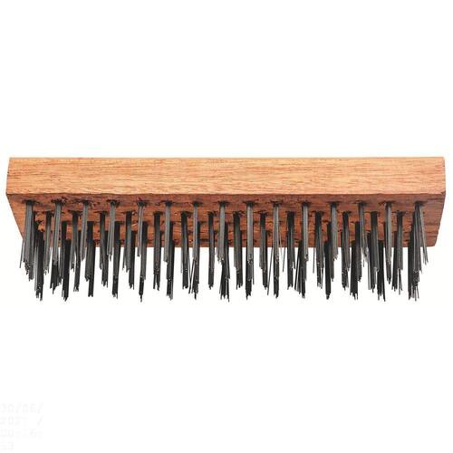 A Escova de Aço Tramontina com Base de Madeira e 5 Fileiras de Cerdas em Aço Especial é uma ferramenta muito usada na limpeza de qualquer superfície. Com a base de madeira você terá mais durabilidade do produto. Além disso, a escova vem com 5 fileiras de arame com cerdas produzidas em aço carbono temperado proporcionando mais qualidade no trabalho. Com o uso da ferramenta, você terá um ambiente mais limpo. Orientações Base em madeira especial. Cerdas produzidas em aço carbono temperado. 5 fileiras de arame.As ferramentas são submetidas a testes de aplicação prática para garantir sua resistência mecânica em uso intenso.Utilizada em trabalhos de limpeza de superfícies em geralAs ferramentas são produzidas e testadas conforme normas específicas. Características Gerais EAN13 7891114112191 DUN14 17891114112198 NCM 9603.90.00 Peso Líquido 0,2100 kg. Peso Bruto 0,2200 kg. Metragem 0,000495 m³. Dimensões Embalagem (Compr. X Larg. X Alt.) 180x 55x 50 mm. Dimensões Produto (Compr. X Larg. X Alt.) 182x 55x 47 mm. Dimensão Extra A 55,0 mm. Dimensão Extra B 182,0 mm. Dimensão Extra C 47,0 mm. Observações Use óculos, luvas e outros equipamentos de proteção de acordo com a tarefa a ser executada. Tenha cuidado com a ponta dos arames, pois eles podem ferir o usuário. Armazene em local limpo e seco.