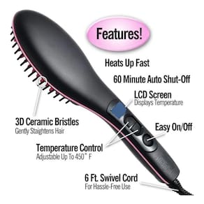 A escova de alisamento de cabelo com gerador de íons duplos tem uma aparência lisa, sedosa, lisa e macia, pode selar a cutícula e reduzir a divisão e os nós. Obtenha cabelos saudáveis e sedosos Obtenha cabelos is, saudáveis e sedosos. Cabo de alimentação rotativo de 360 graus fácil de operar, fácil de usar, fácil de alisar o cabelo em casa de qualquer ângulo, design ergonômico de alça, fácil de operar. Basta ligá-lo, a temperatura da escova de cabelo lisa será exibida no display LED, o display pode monitorar o uso a qualquer momento. Comparado com o PTC no mercado, ele tem vantagens incomparáveis, aquecimento e uniformidade rápidos e uniformes. Materiais de alta qualidade, design anti-escaldante, podem ser aquecidos até a temperatura necessária em apenas um minuto e fornecem excelentes resultados, seguros de usar. Os materiais de aquecimento PTC são s para gerar calor uniforme e evitar queimaduras nos cabelos. A temperatura de aquecimento é ajustável.