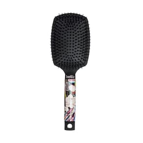 Escova de cabelo com base almofadada que proporciona uma escovação muito mais confortável e cerdas de nylon com pontas protetoras que massageiam o couro cabeludo.