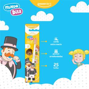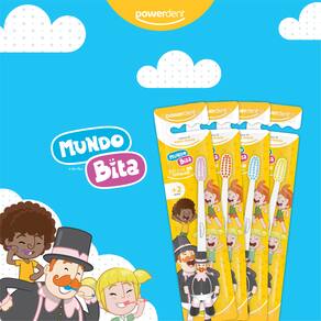 A escova dental infantil Powerdent Mundo Bita é perfeita para a escovação dos dentinhos das crianças sem machucar as gengivas. Possui cabo 3D, o que torna a escovação muito mais divertida.*Concentração de cerdas ideal para uma higiene perfeita dos dentinhos das crianças.Como usar:Passo 1: Coloque uma pequena quantidade de creme dental sobre as cerdas da escova.Passo 2: Posicione a escova em um ângulo de 45º na linha da gengiva.Passo 3: Mova a escova em movimentos para frente e para trás, repita isso em cada dente.Passo 4: Utilize a ponta da escova para escovar atrás de cada dente, com movimentos superiores e inferiores.Power dica:Cuidar dos dentes das crianças é muito importante, acompanhe a escovação dos seus filhos.Fique atento:Trocar a escova dental a cada três meses mantém os dentinhos das crianças saudáveis e livres de cáries.Informações importantes:Visite seu dentista regularmente, ele indicará o melhor tipo de escova para seu filho. O uso do produto deve ser supervisionado por um adulto. Declarado isento de registro pelo Ministério da Saúde. Não compre se a embalagem estiver violada. Conserve em local limpo, fresco e seco.Composição: Resina Termoplástica, Elastômero, Nylon, Âncoras Metálicas e Pigmentos.Mundo Bita © Mr. Plot Produções. Todos os direitos reservados.
