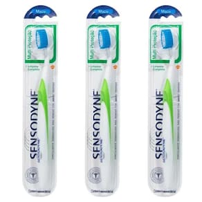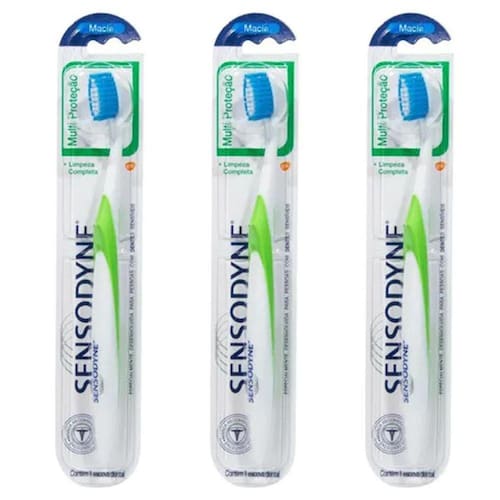 Escova de dente macia multi proteção sensodyne kit x3 Escova macia multi proteção seCerdas macias. Especialmente desenvolvida para limpeza cuidadosa e suave dos dentes e gengivas. Cabeça oval. Desenvolvida para se adaptar as áreas delicadas dos seus dentes e gengivas fornecendo uma limpeza completa da sua boca. Cabeça pequena, limpeza efetiva até mesmo nas áreas de difícil alcance. Cabo anti derrapante, proporciona uma pegada segura e permite um controle melhor da escovação. Modo de uso: é recomendado que sua escova seja trocada a cada 3 meses ápos iniciar o uso ou conforme orientação do dentista. Após o uso, lavar bem a escova e deixar secar em posição vertical. Manter a escova em local seco e arejado.