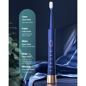 Escova de dentes elétrica Sonicare impermeável IPX7, carga rápida de 2 horas com lembrete de horário inteligente, 5 modos, 8 cabeças de escova, viagem, interior, exterior, azul - ?5 modos opcionais?: Experiência de escovação personalizada com 5 modos com base em suas necessidades específicas: modo limpo, modo polimento, modo suave, modo branco, modo de massagem. 5 modos diferentes se ajustam a diferentes condições de dentes e gengivas e até mesmo cuidam totalmente da sua boca e dentes sensíveis. - Cuidados bucais eficientes: esta escova de dentes elétrica para adultos emprega um motor potente para alcançar 31.000 vibrações por minuto para ajudar você a manter uma limpeza consistente e eficaz de seus dentes e gengivas. Remova mais placas e manchas em comparação com uma escova de dentes manual comum, melhora a saúde das gengivas melhor do que uma escova de dentes manual. - ?8 cabeças de escova?: as cerdas são feitas com nylon dupont que é macio, resistente ao desgaste e não absorvente, proporcionando uma experiência de escovação segura e suave. As cabeças de escova W-wave se encaixam perfeitamente em cada dente e removem melhor as manchas. - ?Temporizador inteligente de 2 minutos?: o temporizador inteligente de 2 minutos oferece uma pausa de intervalo a cada 30 segundos para lembrar você de equilibrar as quatro áreas da sua boca e alcançar o tempo e o hábito de escovação recomendados por profissionais dentários. IPX7 à prova d'água para facilitar o enxágue com água após cada uso. - ?Cabo de carregamento oculto e aderência ergonômica de mão?: a escova de dentes elétrica está equipada com um cabo de carregamento USB oculto na parte inferior do corpo da escova de dentes, conveniente para carregar todos os tipos de bloco de carga e evitar perda. A aderência ergonômica é confortável e antiderrapante. Carregamento rápido até 30 dias de uso (2 min/2x por dia) em uma carga completa e rápida de 2 horas.