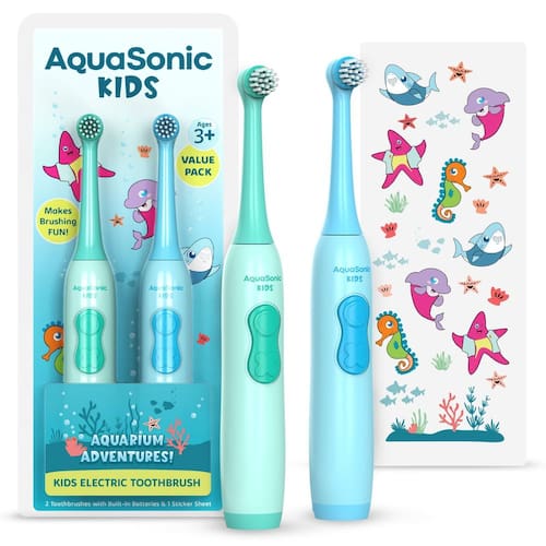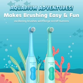 A escova de dentes infantil da Aquarium Adventures é a adição perfeita para a rotina de cuidados dentários do seu filho! Projetado para crianças a partir de 6 anos, este irrigador oral possui uma aderência de borracha, uma operação simples de 1 botão e vem com uma folha adesiva à prova d'água. As crianças podem personalizar e decorar seu fio dental usando quatro personagens adoráveis: Rocco, a estrela do mar, Ziggy o cavalo-marinho, Ruby, o golfinho e Leão, o tubarão. - Pacote com 2 escovas de dentes elétricas adequadas para crianças – Torne a escovação divertida e eficaz com nosso conjunto duplo de escovas de dentes elétricas infantis, perfeito para irmãos ou para guardar uma sobressalente. Projetado para incentivar hábitos saudáveis de higiene bucal em crianças a partir de 3 anos. - Botões simples de ligar e desligar para mãos pequenas – com botões fáceis de pressionar, estas escovas de dentes são projetadas para mãos pequenas, tornando a escovação mais agradável para crianças pequenas, para incentivar a escovação diária consistente. - Cabeças de escova oscilantes suaves com cerdas macias – cada escova de dentes tem movimentos oscilantes suaves e cerdas macias que limpam de forma eficaz, mas permanecem suaves em dentes e gengivas sensíveis. - Pilhas incluídas e folha de adesivo bônus – para maior comodidade, cada escova de dentes vem equipada com uma bateria embutida que durará mais de 90 dias de escovação. O pacote também inclui uma folha adesiva à prova d'água com personagens do Aquarium Adventures: Rocco, a estrela do mar, Ziggy o cavalo-marinho, Ruby, o Golfinho e Leão, o Tubarão. - Conteúdo da embalagem: 2 escovas de dentes elétricas para crianças, 1 folha de adesivo.