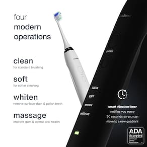 Sistema profissional de casa e viagem para 2 – cuidados bucais de classe mundial ficam ainda melhores com o Duo Pro. O Duo Pro possui 2 escovas de dentes inteligentes à prova d'água IPX7 preto e branco óptico com motores ultrassônicos de 40.000 VPM, baterias de íons de lítio (30 dias com uma única carga), 4 modos exclusivos com temporizadores inteligentes e carregamento sem fio verdadeiro. Uma nova base de carregamento sem fio e higienização UV com temporizador automático mata 99,99% dos germes. O Duo Pro possui 10 cabeças de escova ProFlex e 2 estojos de viagem personalizados para um total de 15 itens. - Sistema Pro Home & Travel para 2 pessoas – Cuidados bucais de classe mundial ficam ainda melhores com o Duo Pro. O Duo Pro possui 2 escovas de dentes à prova d'água IPX7 em preto meia-noite e branco óptico, com motores de 40.000 VPM, baterias de íons de lítio (30 dias com uma única carga), 4 modos exclusivos com temporizadores inteligentes e carregamento sem fio verdadeiro. Uma nova base de carregamento sem fio e higienização UV com temporizador automático mata 99,99% dos germes. O Duo Pro possui 10 cabeças de escova ProFlex e 2 estojos de viagem personalizados para um total de 15 itens. - Mata 99,99% dos germes com higienização UV – enxaguar cabeças de escova faz pouco para matar germes orais restantes. O Duo Pro resolve esse problema usando uma câmara de higienização UV automática para matar 99,99% dos germes e evitar que eles se multipliquem antes da próxima sessão de escovação. As estações de ancoragem de escova dupla também apresentam carregamento sem fio verdadeiro; não é o carregamento USB barato dos concorrentes. - Aceito pelo Conselho de Assuntos Científicos da American Dental Association (ADA) – Colocamos nosso dinheiro onde está sua boca. Investir em tecnologias premium de higiene bucal rendeu à Duo Pro o prestigioso selo de aprovação ADA. Ele demonstrou eficácia na remoção de placa bacteriana e ajuda a prevenir e reduzir a gengivite. O Duo Pro vai além de apenas limpar os dentes – oferece cuidados bucais completos com modos exclusivos que incluem um para clarear e polir os dentes e um para melhorar a saúde das gengivas. - 10 cabeças de escova ProFlex e 2 estojos de viagem incluídos – O Duo Pro possui cabeças de escova ProFlex projetadas pela Dupont que usam cerdas precisamente anguladas com a quantidade certa de elasticidade para melhorar drasticamente a limpeza e o clareamento. Inclui 2 capas de viagem codificadas por cores. Cada escova inteligente Duo Pro dura 30 dias inteiros com uma única carga, então não é necessário levar sua base de carregamento em suas viagens. - O que vem na caixa: 1 escova de dentes inteligente preta meia-noite, 1 escova de dentes inteligente branca óptica, 1 base de carregamento sem fio e higienizadora UV, 5 cabeças de escova ProFlex pretas Midnight Black, 5 cabeças de escova ProFlex brancas ópticas, 1 estojo de viagem preto meia-noite, 1 estojo de viagem branco óptico.