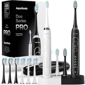 Aquasonic Duo Series Pro - Escovas de dentes aceitas pela ADA com tecnologia poderosa: a Duo Series PRO é a próxima geração da série Duo favorita dos clientes, agora com tecnologia mais avançada. Seu potente motor de 50.000 vibrações por minuto com temporizadores inteligentes e 5 modos de escovação — incluindo limpeza, macio, branqueamento, massagem e limpeza profunda — proporcionam uma experiência de higiene bucal personalizada para dentes e gengivas mais saudáveis. - Carregamento sem fio e longa vida útil da bateria: aproveite a conveniência do carregamento sem fio e uma bateria de longa duração que oferece até 30 dias de uso com uma única carga. Perfeito para uso diário em casa ou durante viagens sem recarga constante. - Cabo acetinado impermeável e ergonômico – Projetado para durabilidade e conforto, o Duo Series Pro possui uma classificação IPX7 à prova d'água, permitindo que você escove no chuveiro. A elegante alça de toque acetinado garante uma aderência confortável e antiderrapante para uma experiência de escovação sem esforço. - 10 cabeças de escova de substituição e 2 estojos de viagem incluídos – Economize em substituições com 10 cabeças de escova ProFlex incluídas, projetadas para durar mais de um ano de escovação, para 2 pessoas. As capas de viagem premium adicionam proteção e higiene extra, facilitando levar sua escova de dentes aonde quer que você vá. - Inclui: 2 alças de escova de dentes, 10 cabeças de escova ProFlex, 2 estojos de viagem premium, base dupla de carregamento sem fio.