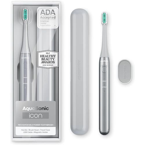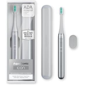 Aprovada pela ADA: a escova de dentes elétrica recarregável AquaSonic Icon ganhou o prestigioso selo de aprovação da American Dental Academy. Aumente sua escovação: use a mesma técnica de escovação que uma escova de dentes manual, enquanto a Icon produz microvibrações para melhorar o efeito de limpeza. Tecnologia moderna: o ícone possui 2 modos de escovação e um temporizador inteligente integrado que sinaliza a cada 30 segundos e desliga após 2 minutos. Sua bateria de íons de lítio mantém uma carga por mais de 30 dias de escovação. Armazenamento elegante: vem com um suporte magnético e um estojo de viagem ultrafino para manter o ícone limpo e facilmente acessível quando não estiver em uso. Inclui: alça de escova de dentes, cabeça de escova, suporte magnético, estojo de viagem, cabo de carregamento. - Aprovada pela ADA: a escova de dentes elétrica recarregável AquaSonic Icon ganhou o prestigioso selo de aprovação da American Dental Academy. - Aumente sua escovação: use a mesma técnica de escovação que uma escova de dentes manual, enquanto a Icon produz microvibrações para melhorar o efeito de limpeza. - Tecnologia moderna: o ícone possui 2 modos de escovação e um temporizador inteligente integrado que sinaliza a cada 30 segundos e desliga após 2 minutos. Sua bateria de íons de lítio mantém uma carga por mais de 30 dias de escovação. - Armazenamento elegante: vem com um suporte magnético e um estojo de viagem ultrafino para manter o ícone limpo e facilmente acessível quando não estiver em uso. - Inclui: alça de escova de dentes, cabeça de escova, suporte magnético, estojo de viagem, cabo de carregamento.