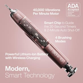 Série preta - Escova de dentes inteligente de 40.000 VPM – Beleza, inteligência e potência. A série Vibe é uma escova de dentes elétrica moderna de classe mundial com a tecnologia mais atualizada. Possui um motor ultra potente e líder do setor que produz 40.000 vibrações por minuto, bateria de íon de lítio, carregamento sem fio ultrarrápido, operação em 4 modos, temporizadores de vibração inteligentes, 8 cabeças de escova projetadas pela DuPont e um estojo de viagem personalizado; tudo com um corpo elegante, ultrafino, leve e com classificação IPX7. - Aceito pelo Conselho de Assuntos Científicos da American Dental Association (ADA) – Colocamos nosso dinheiro onde está sua boca. Investir em tecnologias de higiene bucal premium rendeu à série Vibe o prestigioso selo de aprovação ADA. Ele demonstrou eficácia na remoção de placa bacteriana e ajuda a prevenir e reduzir a gengivite. A série Vibe vai além de apenas limpar os dentes – oferece cuidados bucais completos com modos exclusivos que incluem um para clarear e polir os dentes e um para melhorar a saúde das gengivas. - 8 cabeças de escova DuPont e estojo de viagem incluídos: cada escova de dentes Vibe Series vem com 8 cabeças de escova projetadas pela mundialmente famosa DuPont; líder mundial em qualidade e ciência de materiais. Cada cabeça de escova dura 3 meses, então 8 duram 2 anos. Também está incluída uma conveniente capa rígida personalizada feita de plástico livre de BPA com espaço para duas cabeças de escova. A série Vibe pode durar 4 semanas inteiras (2 min/2 x por dia) com carga total, por isso é perfeita para viagens em movimento com o estojo de viagem incluído. - Tecnologia moderna para cuidados bucais completos: a série Vibe traz escovas de dentes aos tempos modernos com seus recursos aprimorados embutidos. Carregamento sem fio ultrarrápido (esqueça o carregamento USB barato), 4 modos de escovação distintos e um temporizador de notificação vibratório inteligente são alguns dos recursos aprimorados integrados ao elegante cabo à prova d'água e incrivelmente bonito em ouro rosa acetinado. - O que vem na caixa: 1 escova de dentes inteligente ouro rosa acetinado, 8 cabeças de escova DuPont, 1 estojo de viagem personalizado, manual do usuário (sem garantia de versão em português).