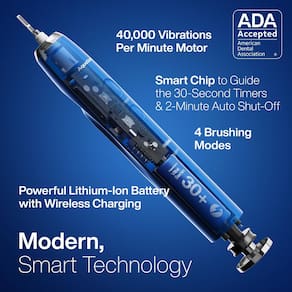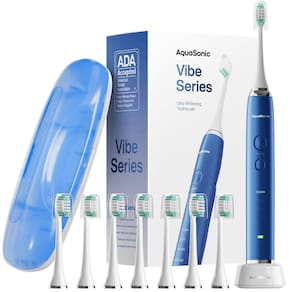 Aquasonic Escova de dentes ultra branqueadora Vibe Series – Escova de dentes elétrica aceita ADA – 8 cabeças de escova e estojo de viagem – Motor de 40.000 VPM e carregamento sem fio – 4 modos com temporizador inteligente - Escova de dentes inteligente de 40.000 VPM – Beleza, inteligência e potência. A série Vibe é uma escova de dentes elétrica moderna de classe mundial com a tecnologia mais atualizada. Possui um motor ultra potente e líder do setor que produz 40.000 vibrações por minuto, bateria de íon de lítio, carregamento sem fio ultrarrápido, operação em 4 modos, temporizadores de vibração inteligentes, 8 cabeças de escova projetadas pela DuPont e um estojo de viagem personalizado; tudo com um corpo elegante, ultrafino, leve e com classificação IPX7. - Aceito pelo Conselho de Assuntos Científicos da American Dental Association (ADA) – Colocamos nosso dinheiro onde está sua boca. Investir em tecnologias de higiene bucal premium rendeu à série Vibe o prestigioso selo de aprovação ADA. Ele demonstrou eficácia na remoção de placa bacteriana e ajuda a prevenir e reduzir a gengivite. A série Vibe vai além de apenas limpar os dentes – oferece cuidados bucais completos com modos exclusivos que incluem um para clarear e polir os dentes e um para melhorar a saúde das gengivas. - 8 cabeças de escova DuPont e estojo de viagem incluídos: cada escova de dentes Vibe Series vem com 8 cabeças de escova projetadas pela mundialmente famosa DuPont; líder mundial em qualidade e ciência de materiais. Cada cabeça de escova dura 3 meses, então 8 duram 2 anos. Também está incluída uma conveniente capa rígida personalizada feita de plástico livre de BPA com espaço para duas cabeças de escova. A série Vibe pode durar 4 semanas inteiras (2 min/2 x por dia) com carga total, por isso é perfeita para viagens em movimento com o estojo de viagem incluído. - Tecnologia moderna para cuidados bucais completos: a série Vibe traz escovas de dentes aos tempos modernos com seus recursos aprimorados embutidos. Carregamento sem fio ultrarrápido (esqueça o carregamento USB barato), 4 modos de escovação distintos e um temporizador de notificação vibratório inteligente são alguns dos recursos aprimorados embutidos no elegante cabo azul safira à prova d'água e incrivelmente bonito. - Conteúdo da embalagem: 1 escova de dentes inteligente azul safira, 8 cabeças de escova DuPont com tampas protetoras para manter suas cabeças de escova limpas, 1 estojo de viagem personalizado, manual do usuário (sem garantia de versão em português).