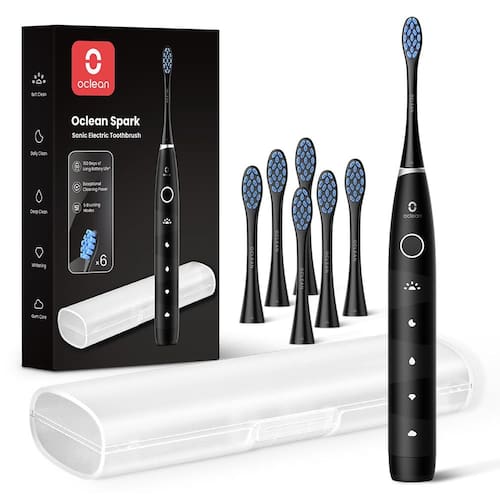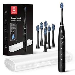 Oclean Escova de dentes elétrica para adultos, 150 dias de vida útil da bateria, escova de dentes sônica recarregável por USB com 6 cabeças de escova e estojo de viagem, 5 modos e temporizador inteligente - Excelente poder de limpeza: com um motor potente com cerdas de alta densidade de 76.000 rpm, esta escova de dentes elétrica recarregável pode fornecer limpeza superior e suave para placas, manchas, resíduos e alimentos presos, deixando seus dentes limpos e seu hálito fresco! - Recarregável por USB e longa vida útil da bateria: a escova de dentes elétrica recarregável tem uma longa vida útil de até 150 dias sem sacrificar o desempenho, para que você nunca seja pego de surpresa durante a escovação. Em apenas 10 minutos de carregamento, esta escova de dentes pode ser usada diariamente por até 2 semanas. - 5 modos de limpeza personalizada: nossas escovas de dentes recarregáveis para adultos são projetadas com 5 modos de limpeza – Limpeza suave, limpeza diária, limpeza profunda, clareamento e cuidado das gengivas que fornecem mais tempo de escovação para limpeza profunda ou escovação suave para gengivas sensíveis, adaptando-se a todas as necessidades ou preferências de escovação. - Cerdas DuPont de alta densidade: a escova de dentes para adultos possui cerdas DuPont de alta densidade e um formato W ergonômico que oferece excelente limpeza, alcançando até os pontos e áreas mais difíceis, protegendo o esmalte e sendo suave nas gengivas. - Conjunto completo com estojo de viagem: nosso kit de escova de dentes chega em um conjunto completo com 6 cabeças de substituição de escova de dentes que durarão anos e 1 x estojo de escova de dentes de viagem para armazenamento conveniente e seguro durante viagens, férias, viagens ou feriados.