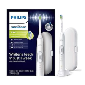 PHILIPS Sonicare Escova de dentes elétrica recarregável ProtectiveClean 6100, com sensor de pressão, 3 modos de limpeza, SmarTimer e QuadPacer, vida útil da bateria de 14 dias, estojo de viagem, - Clareamento suave e cuidados bucais eficientes: Philips Sonicare ProtectiveClean 6100 melhora a saúde das gengivas em apenas 2 semanas e ajuda a reduzir cáries - Escovação inteligente: um sensor de pressão que detecta automaticamente a pressão que você aplica, avisa e reduz as vibrações da escova de dentes para ajudar a proteger suas gengivas - Cuidados bucais personalizados: modo de limpeza para limpeza superior, modo branco para remover manchas superficiais e modo de cuidado gengival para massagear suavemente suas gengivas; com 3 níveis de intensidade para ainda mais personalização - Melhore sua rotina de higiene bucal com a tecnologia sônica: até 62.000 movimentos de escova por minuto, limpe suavemente os dentes, quebre a placa bacteriana e remova para uma limpeza diária excepcional - Design de escova de dentes de viagem: esta escova de dentes vem com um estojo de viagem para facilitar a portabilidade e manter a higiene dental em movimento; a base de carregamento compacta mantém você pronto para 14 dias de uso regular - Design branco elegante: uma escova de dentes elétrica branca elegante que melhora qualquer estética de banheiro - O conjunto inclui: 1 pega, 1 x cabeça de escova Diamond Clean, 1 estojo de viagem, 1 carregador