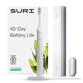 SURI Escova de dentes elétrica — Escovas de dentes elétricas sustentáveis para adultos, escova de dentes sônica fina e acessórios, bateria de 40 dias, escova de dentes de viagem com estojo de limpeza - Fina mas potente e limpa: a premiada escova de dentes sônica SURI tem 1/2 do tamanho de uma escova de dentes elétrica padrão e proporciona uma limpeza sônica profissional vibrando mais de 33.000 vezes por minuto. - Cabeça e cerdas recicláveis à base de plantas — as escovas de dentes elétricas e acessórios SURI são projetados com o planeta em mente. Com cabeças de escova feitas com amido de milho renovável e cerdas macias médias feitas de óleo de rícino. A SURI recicla estes — gratuitamente - Estojo de viagem UV – SURI inclui um estojo de viagem fino que usa tecnologia UV-C para limpar a cabeça da escova de dentes em apenas 1 minuto. Ele também carrega sua escova quando conectado. Finalmente, uma escova de dentes elétrica de viagem que você vai adorar - Bateria de longa duração de mais de 40 dias – Imagine precisar carregar sua escova de dentes apenas uma vez por mês. Nossa escova de dentes recarregável para adultos dura mais de 40 dias e recarrega em apenas 4 horas via USB. Uma escova de dentes elétrica confiável — alimentada por bateria e pronta para usar - Dentes mais limpos após apenas um uso – Projetado e amado por dentistas, em testes clínicos, nossa escova de dentes SURI removeu 300% mais placa do que uma escova de dentes manual. Elétrico é o caminho a seguir para quem procura dentes mais saudáveis e gengivas menos sensíveis