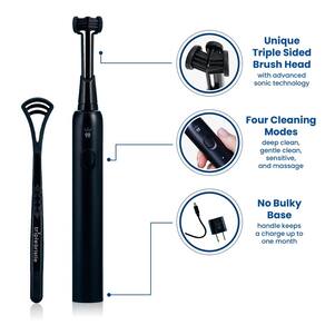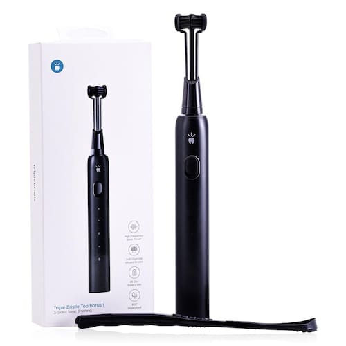 A escova de dentes sônica Triple Bristle Max de 3 lados foi desenvolvida com base no feedback de nossa valiosa comunidade e está repleta de recursos que revolucionarão sua rotina de escovação. Uma das características de destaque do Triple Bristle Max é seu design exclusivo de cabeça de escova de 3 lados, que permite que você limpe todas as superfícies ao mesmo tempo com suas cerdas angulares e cabeça flexível. Isso significa que você pode obter uma limpeza completa em menos tempo, tornando sua rotina matinal mais eficiente do que nunca. Com quatro modos de limpeza - limpeza profunda, limpeza suave, sensível e massagem - você pode personalizar sua experiência de escovação para atender às suas necessidades. O temporizador inteligente de 2 minutos garante que você escove pela duração recomendada e, com até 42.000 vibrações sônicas por minuto, sua boca ficará super revigorada e revitalizada após cada uso. O Triple Bristle Max não é apenas eficiente, mas também é suave para seus dentes e gengivas. As cerdas macias com infusão de carvão de nylon proporcionam uma experiência de escovação confortável, enquanto ainda removem efetivamente placas e detritos. Isso o torna adequado para pessoas com dentes ou gengivas sensíveis, e também ideal para limpeza de trabalhos dentários, como aparelhos, implantes, coroas e facetas. Atualize sua rotina de higiene bucal com a escova de dentes sônica Triple Bristle Max de 3 lados e experimente um novo nível de limpeza como nunca antes. Adquira o seu hoje e desfrute de um sorriso mais brilhante e saudável! - TRIPLE BRISTLE Máxima – Nossa linda escova de dentes sônica recarregável preta tem uma cabeça patenteada de 3 cabeças que faz o trabalho em 1/3 do tempo. - Reduz os níveis de placa, dor de gengiva e sangramento – a escova de dentes de três lados com infusão de carvão de nylon macio fácil de usar para adultos e crianças é perfeitamente inclinada para entrar naqueles lugares difíceis de alcançar. - Bateria recarregável – a nova alça de escova de dentes elétrica leve de 3 lados está equipada com uma luz indicadora de carregamento que ajudará você a manter sua escova de dentes carregada. A carga dura até um mês. - Criado por dentistas e aprovado por dentistas: nosso design exclusivo de escova de dentes tripla está revolucionando a maneira como limpamos os dentes e é recomendado por dentistas nos Estados Unidos. - Uma escova de dentes para todos: a alça fina e fácil de segurar e a cabeça de escova rápida e eficaz foram feitas para todos!