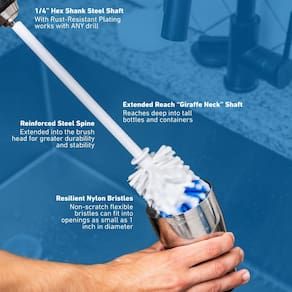 Use o poder e a ação rotativa da sua furadeira para limpar seus recipientes de forma mais rápida, fácil e eficaz do que nunca! A RotoScrub funciona com qualquer furadeira ou chave de impacto. Perfeito para remover manchas difíceis e sujeira de garrafas de água de vidro, plástico ou aço inoxidável, copos, garrafas de coqueteleira, copos, canecas de café, canecas de viagem, potes de café, jarros, jarros, liquidificadores, chaleiras elétricas, potes de pedreiro, copos e praticamente qualquer outro recipiente que precise de limpeza. A escova de perfuração RotoScrub também funciona muito bem para panelas, frigideiras e pratos. Nosso design de "pescoço de girafa" de alcance estendido com patente pendente com espinha de aço reforçado alcança profundamente os recipientes para obter todas as áreas difíceis de alcançar. As cerdas de nylon flexíveis duráveis podem caber em aberturas de até 2,5 cm de diâmetro (a escova não se encaixa em garrafas de vinho padrão ou garrafas de cerveja). Obtenha a ferramenta certa para o trabalho e melhore sua experiência de limpeza com o RotoScrub! Furadeira sem fio não incluída. - Construção durável: Feito de nylon e plástico para uso duradouro. - Design flexível: a cabeça redonda da escova permite uma limpeza completa de áreas difíceis de alcançar. - Uso multiuso: pode ser utilizado para limpar garrafas de água, canecas de café, xícaras, panelas, copos, potes, liquidificadores e jarros. - Tamanho compacto: pesa apenas 0,3 g para armazenamento conveniente. - Marca confiável: da RotoScrub, uma marca líder em ferramentas de limpeza de cozinha.